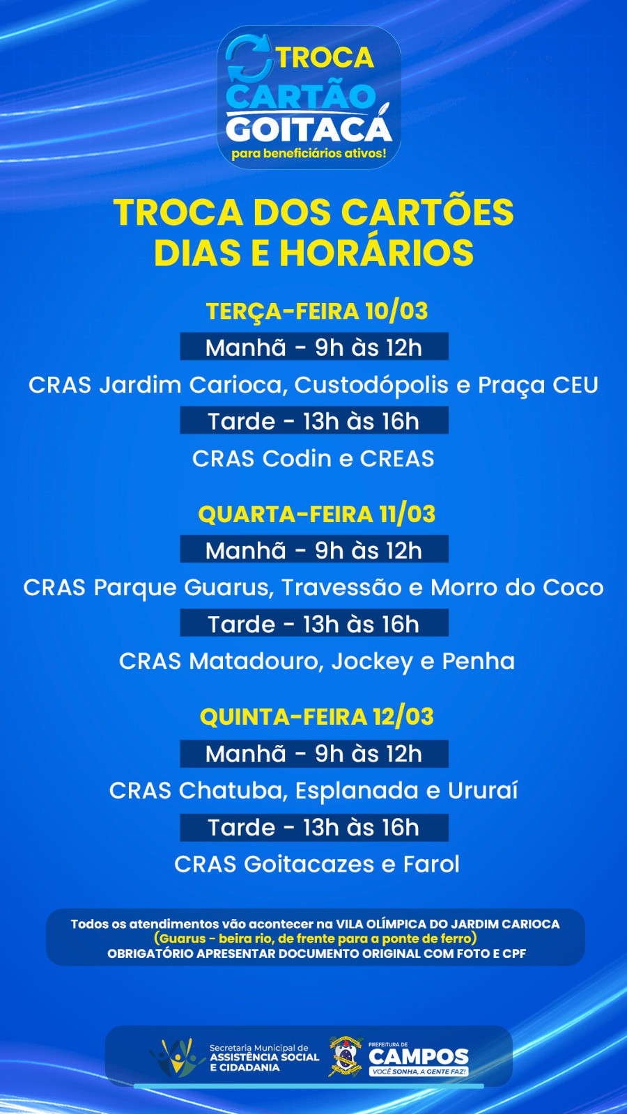 A partir da recarga do saldo de março, que foi efetuada no último domingo (1º), os beneficiários do Cartão Goitacá, programa de transferência de renda da Secretaria de Assistência Social e Cidadania, devem fazer a troca dos cartões. Para o procedimento, a SMASC montou um calendário de atendimento nos dias 10, 11 e 12 de março, na Vila Olímpica Lulu Beda, no Jardim Carioca. Confira AQUI. A mudança dos cartões ocorre em função do término do contrato com a antiga operadora e início da operação com uma nova empresa. Para realizar a troca é necessário apresentar um documento original com foto e CPF.